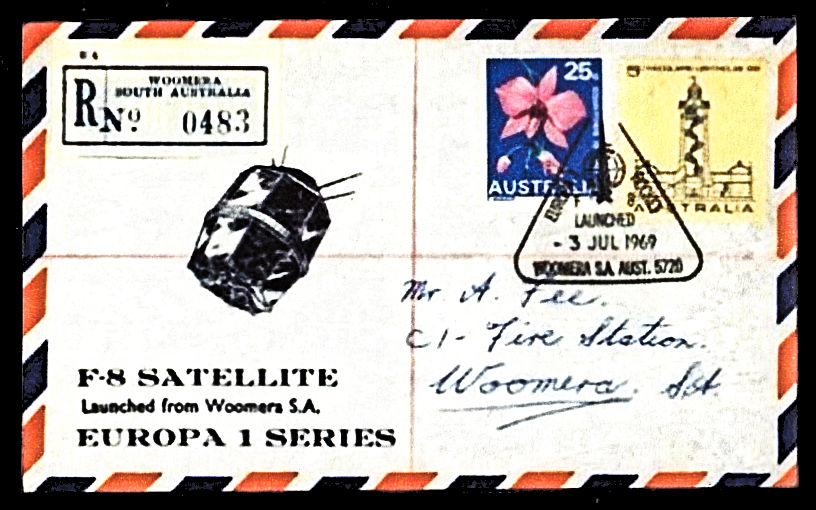 This table represents event covers released for the ELDO F-8 rocket launch from the Woomera Rocket Range, South Australia. Australia Post produced a special illustrative postmark for this launch.